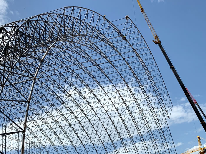 (2)网架加工前应对现场尺寸进行复测,确认无误后方可进行加工、安装;网架制作、运输、安装应遵守《空间网格结构技术规程》JGJ7-2010、《钢网架枣庄螺栓球节点》JG/T 10-2009、《钢网架枣庄螺栓球节点用高强度螺栓》 GB/T 16939-2016、《枣庄钢结构枣庄工程枣庄施工规范》 GB50755-2012、《枣庄钢结构枣庄工程施工质量验收标准》 GB50205-2020。